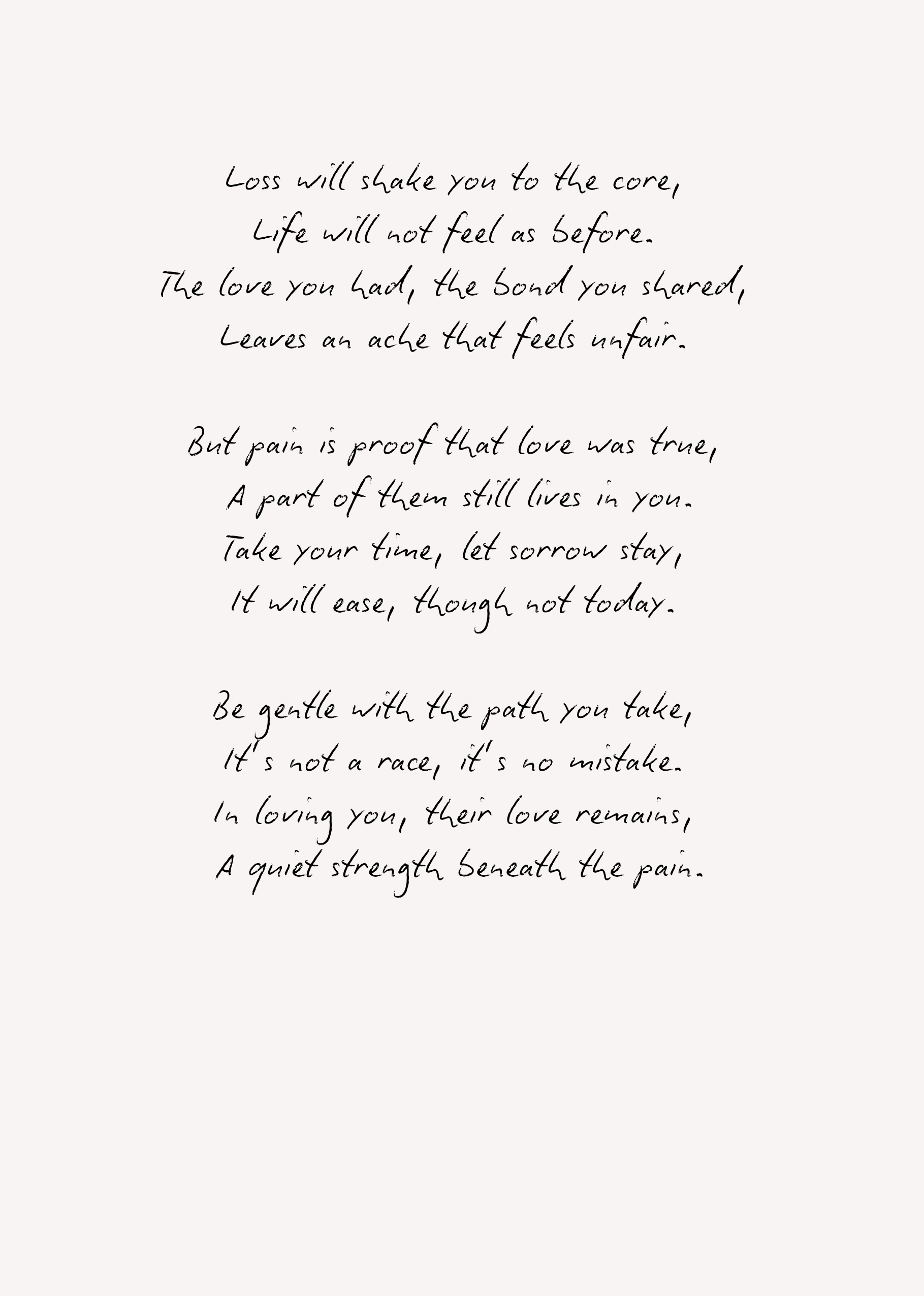Printed on elegant linen-textured cardstock, the words flow in a handwritten script style, offering a deeply personal and poetic touch. It’s a quiet companion for someone navigating grief, especially after the loss of a partner, parent, or soulmate.